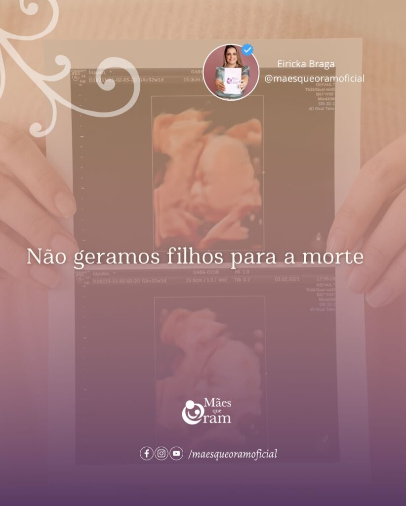 Não geramos filhos para a morte mas para produzir vida. Não geramos filhos para a perdição mas para salvação. Geramos filhos para povoar o céu! Eles são herança de Deus à nós, são filhos da promessa mesmo aqueles que (por nós) não foram planejados, mesmo aqueles que vieram em uma embalagem especial, mesmo aqueles que ficam nessa Terra por um curto período de tempo. Por isso lute por eles, chore por eles, ore por eles, jejue por eles, até vê-los como coroa de glória nas mãos de um Deus que nos capacita a realizar essa doce, alegre, e árdua missão de Mãe. Não desista de orar pelos seus filhos, não abra mão de vê-los no altar decom Deus.